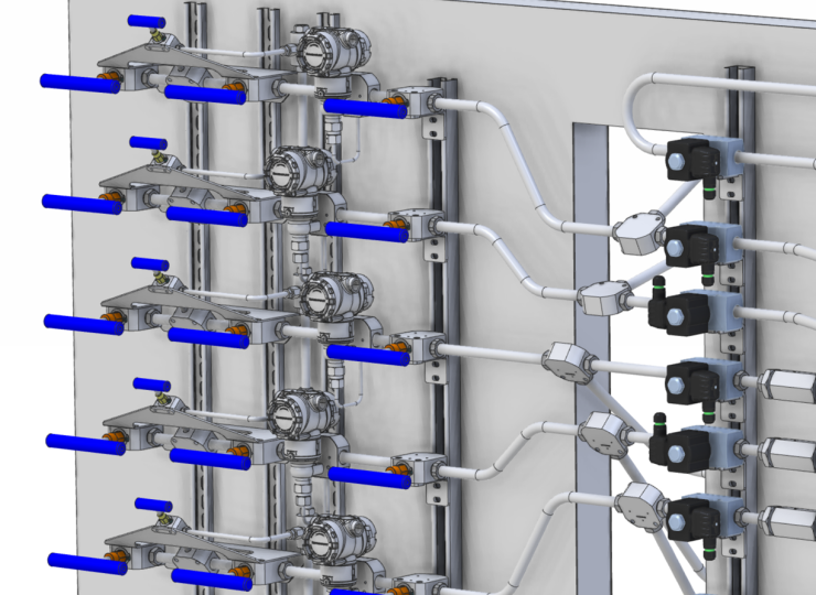 Das System ist eine Mischung aus manuellen Nadelventilen, Magnetventilen, Filtern und digitalen Messgeräten in Kombination mit ¾" CNC-gebogenen Rohren, die für glatte Rundungen und hervorragende Dichtungsflächen sorgen. Im Rahmen der Qualitätskontrolle und der FAT wurde das System vor der Auslieferung mit 550 bar Wasserstoff dicht getestet.